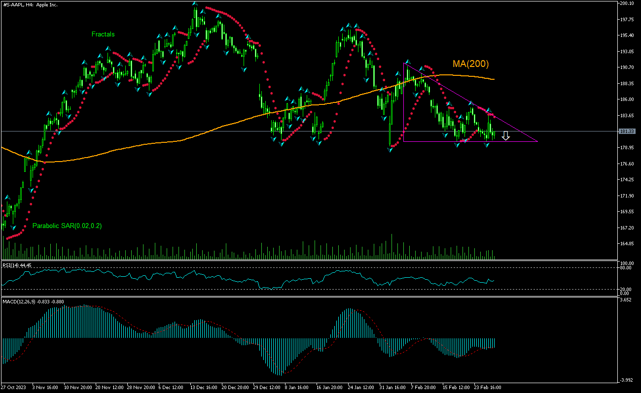 The technical analysis of the Apple stock price chart on 4-hour timeframe shows #S-AAP,H4 is retracing down to test the support of a descending triangle after testing the 200-period moving average MA(200). We believe the bearish momentum will continue after the price breaches below the support of the descending triangle at 179.09. A level below this can be used as an entry point for placing a pending order to sell. The stop loss can be placed above 183.47. After placing the order, the stop loss is to be moved every day to the next fractal high, following Parabolic signals. Thus, we are changing the expected profit/loss ratio to the breakeven point. If the price meets the stop loss level (183.47) without reaching the order (179.09), we recommend cancelling the order: the market has undergone internal changes which were not taken into account.